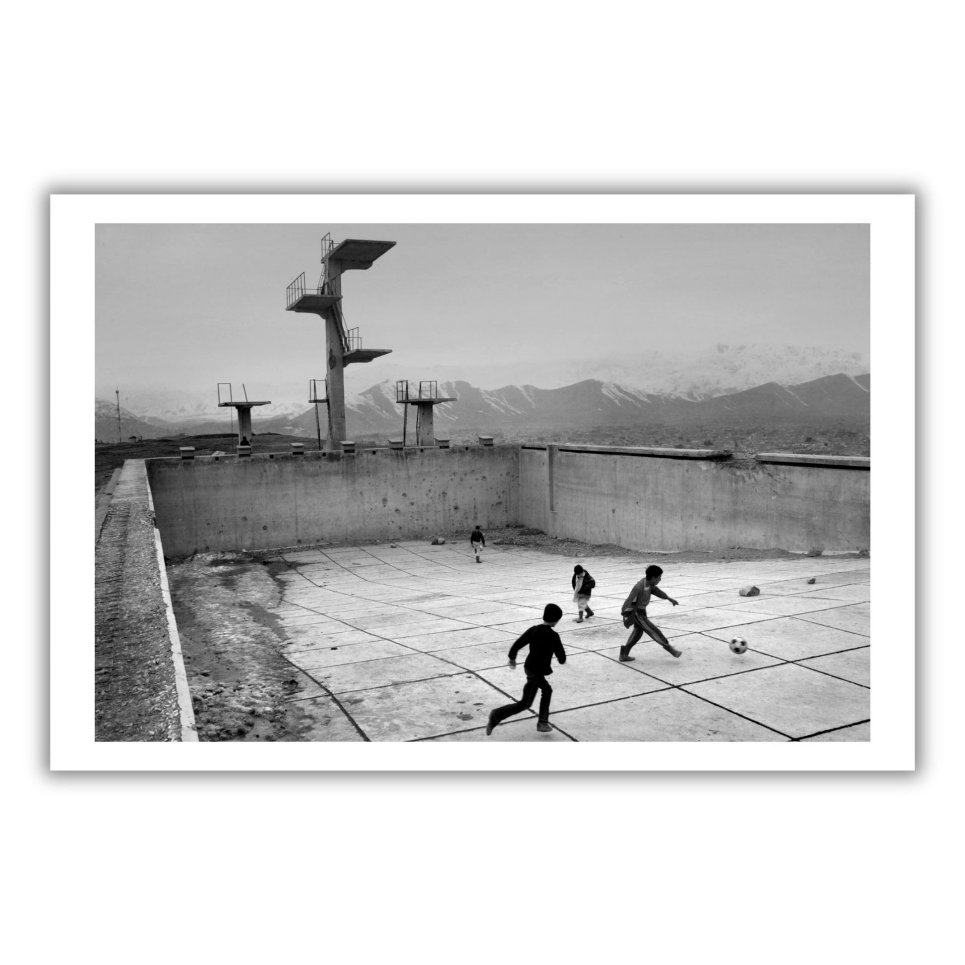 Boys play soccer inside an empty swimming pool dating from the Soviet occupation. The hilltop pool was damaged by shelling during the country's civil war and is now a favorite place for youth to congregate and play games. Afghanistan, 26 February 2005.