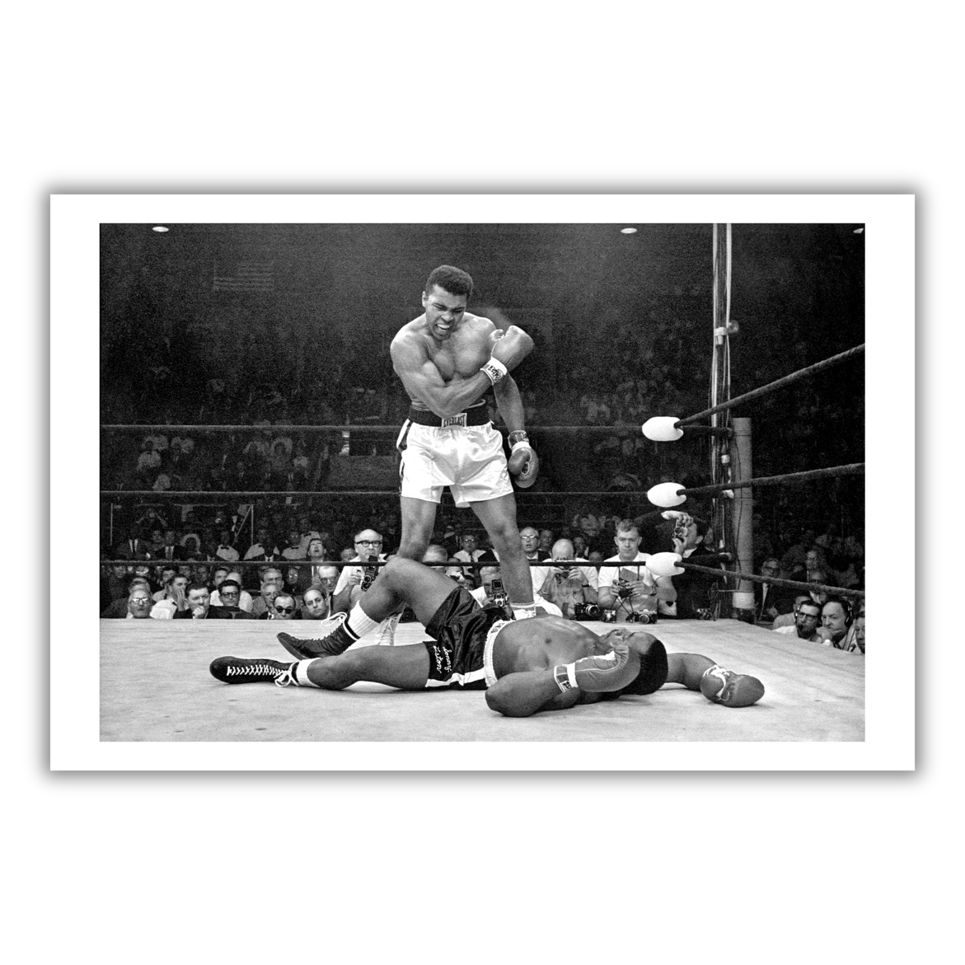 Heavyweight champion Muhammad Ali stands over fallen challenger Sonny Liston, shouting and gesturing shortly after dropping Liston with a short hard right to the jaw, at 1:44 in the first round of their bout at the Central Maine Youth Center in Lewiston Maine on May 25, 1965.