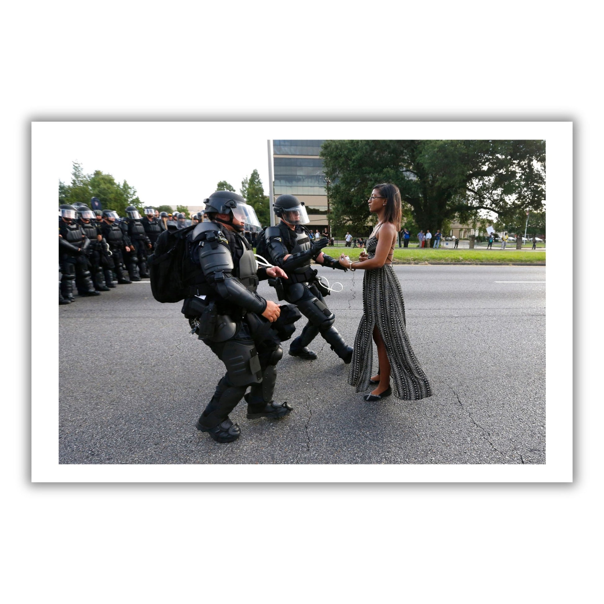 Ieisha Evans (27) stands her ground at a rally against police violence against Black men, outside the Baton Rouge Police Department in Louisiana, USA, on 9 July 2016. Evans had travelled to Baton Rouge to protest the death of Alton Sterling, who was shot at close range while being held to the ground by two white police officers on 5 July. The fatal shooting of Sterling came at a time of heightened tension in the US over the deaths of Black men at the hands of the police. Data collected by The Counted, an initiative set up by The Guardian to record such fatalities, found that in 2016, Black males aged 15-34 were nine times more likely than other Americans to be killed by law enforcement officers. Evans was arrested at the protest, but released later that evening.