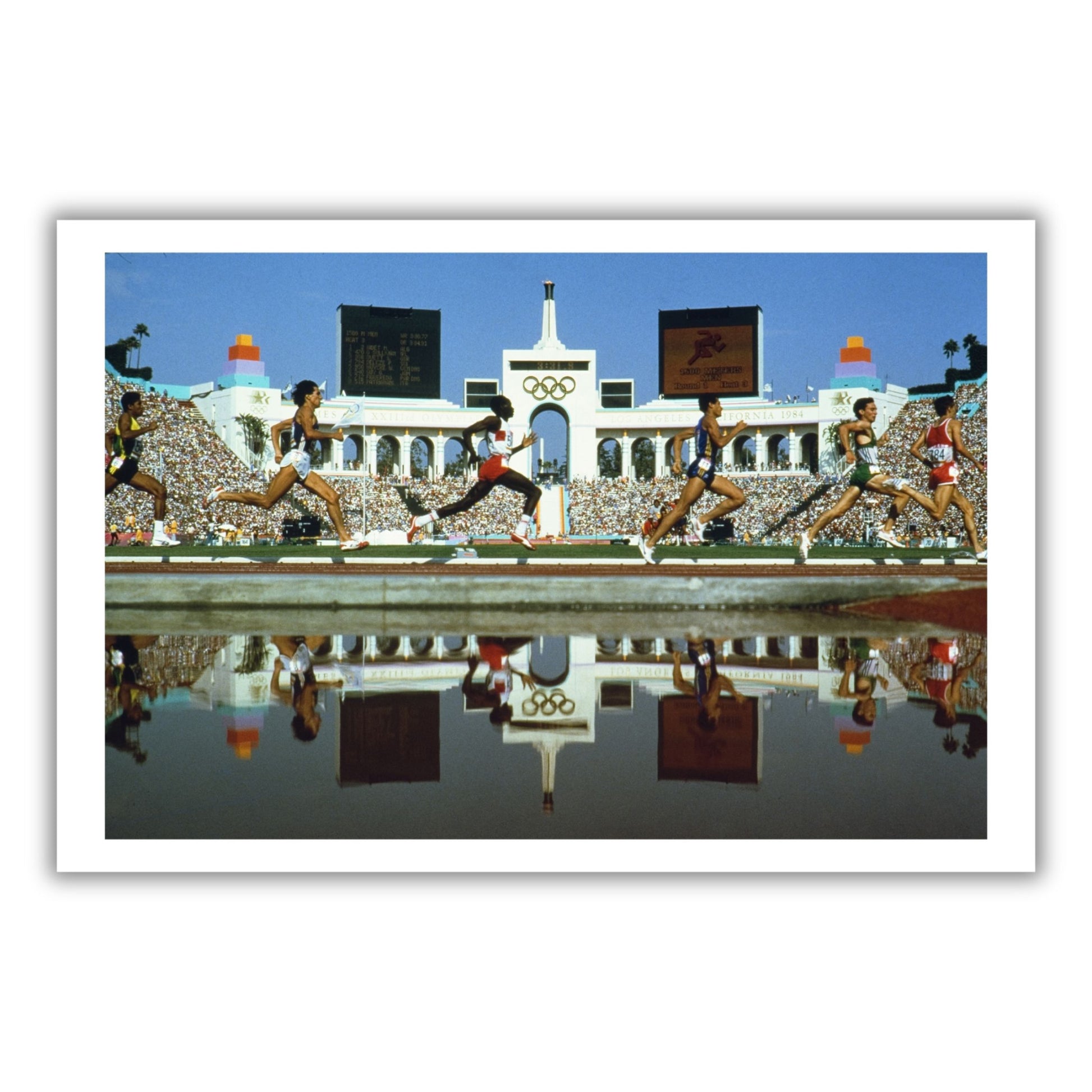 The Summer Olympic Games: Runners in the men's 1500m event stride past the Los Angeles Coliseum on 11 August 1984.