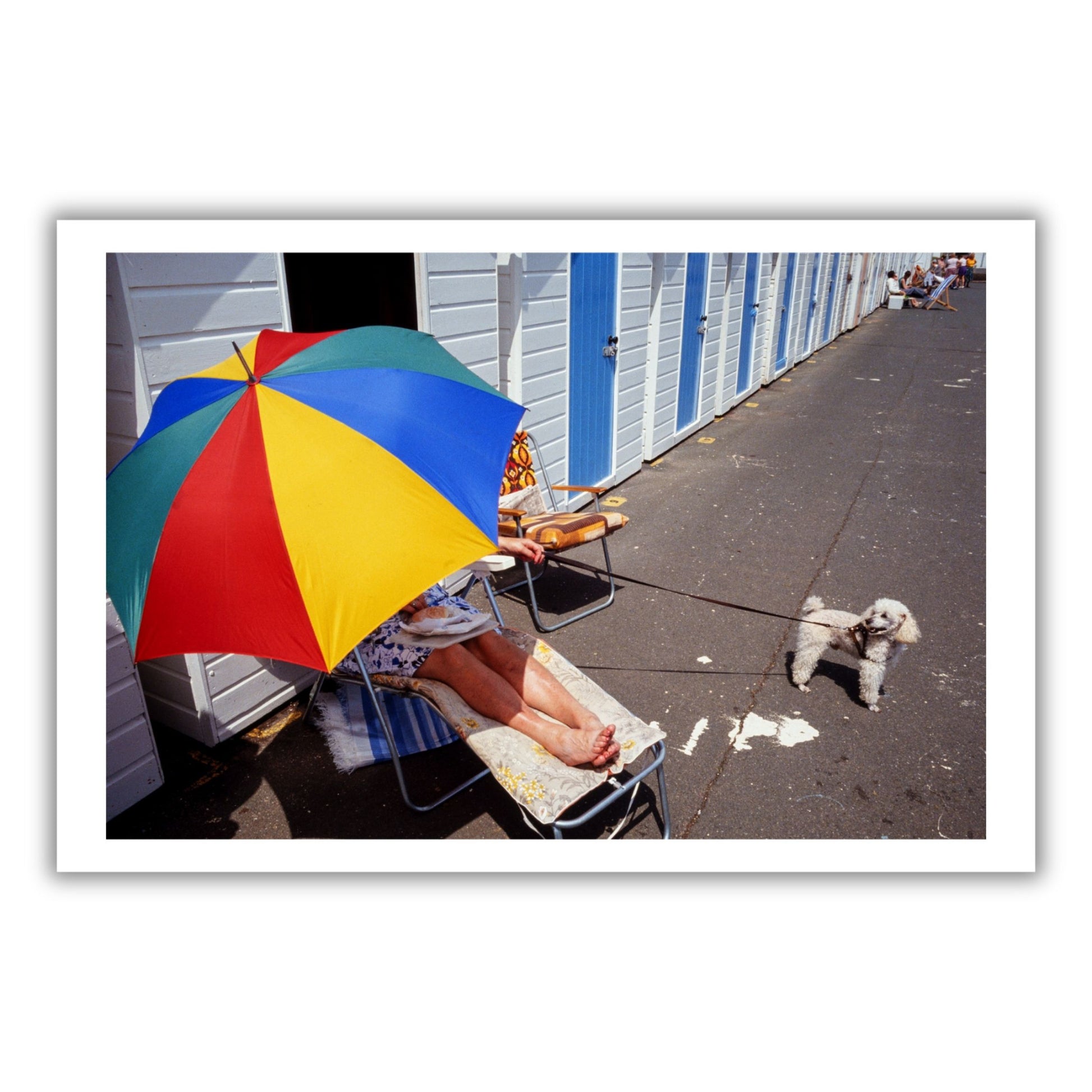 Shaded from the midday sun, a holidaymaker holds onto her pet poodle on Paignton seafront, England, 1993. During the economic recession, as many Britons tightened their belts, thousands chose to holiday on local beaches rather than travel to Mediterranean resorts.