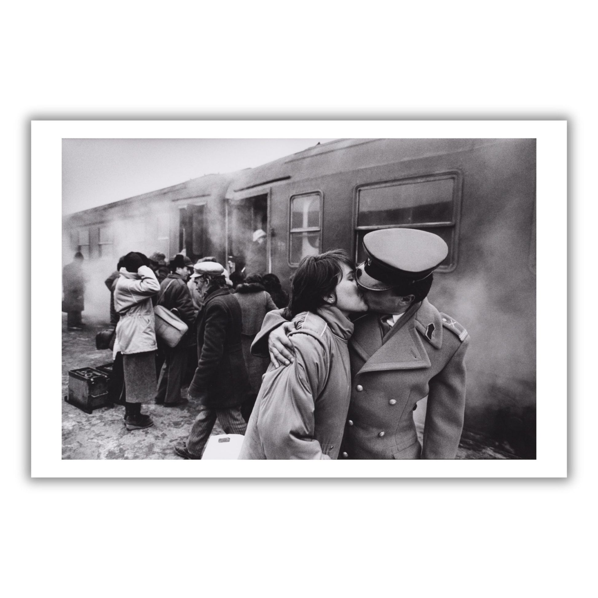 A Romanian soldier is welcomed home by his girlfriend on his return to Brasov after weeks of uninterrupted duty in Bucharest, where there had been mass demonstrations and confrontations between political parties fighting for power after the revolution. 1990.